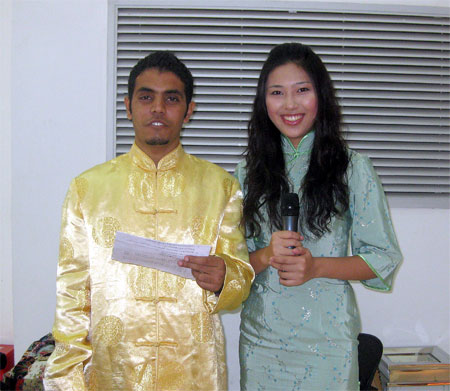 重慶師范大學(xué)地理與旅游學(xué)院藝術(shù)教育(空乘與禮儀方向)2010級(jí)的同學(xué)們?cè)陂_營(yíng)儀式上表現(xiàn)優(yōu)秀,其中劉佳樂(lè)同學(xué)和來(lái)自也門的留學(xué)生Ebrahim共同擔(dān)任了此次活動(dòng)的主持人,她大方得體、從容不迫的主持風(fēng)格得到觀眾好評(píng)。這些未來(lái)將在藍(lán)天翱翔的驕子,將她們美麗的笑容遍布在現(xiàn)場(chǎng)的每一個(gè)角落,從前臺(tái)禮儀、接待、會(huì)場(chǎng)引導(dǎo)的細(xì)小工作到在舞臺(tái)上表演為外國(guó)友人準(zhǔn)備的中國(guó)特色十足的節(jié)目,她們都一絲不茍,認(rèn)真對(duì)待,優(yōu)雅從容,充分展現(xiàn)了空乘學(xué)子的風(fēng)采。