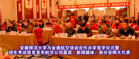 本網(wǎng)訊 在萬物復(fù)蘇、孕育希望的三月一日,安徽師范大學(xué)與“金通航空培訓(xùn)”合作辦學(xué)簽字儀式暨招生考試信息發(fā)布會(huì)在安徽省蕪湖市百瑞中央城大酒店舉行。安徽師范大學(xué)領(lǐng)導(dǎo)王倫、顧家山、李進(jìn)華,金通航空培訓(xùn)服務(wù)有限公司董事長(zhǎng)焦殿成、副總經(jīng)理郭文,南方航空、東方航空、廈門航空、雨潤(rùn)集團(tuán)等單位負(fù)責(zé)人出席了簽字儀式,蕪湖市有關(guān)單位負(fù)責(zé)人、安徽師范大學(xué)有關(guān)部門的負(fù)責(zé)同志、南京旅游職業(yè)學(xué)院部分師生,安徽省部分中學(xué)校長(zhǎng),新聞單位和媒體記者以及學(xué)生代表共500余人參加了儀式。安徽師范大學(xué)副校長(zhǎng)李進(jìn)華和黨委宣傳部部長(zhǎng)、新聞中心主任李忠先后主持簽字儀式和信息發(fā)布會(huì)。