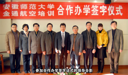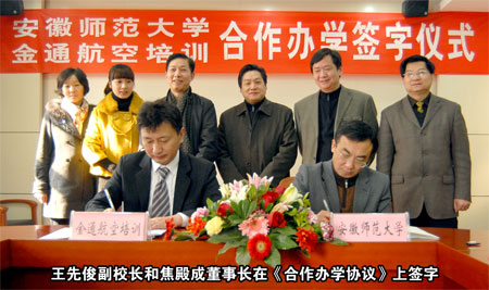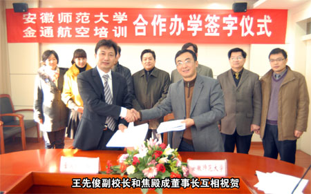 安徽師范大學與“金通航空培訓” 簽訂合作辦學協(xié)議 本報訊 在2010年即將過去,2011年即將到來之際,“金通航空培訓”又一所合作辦學院校正式宣告建立。2010年12月21日上午,安徽師范大學與金通航空培訓服務有限公司合作辦學協(xié)議簽訂儀式在安徽蕪湖舉行。受安徽師范大學黨委和行政的委托,安徽師范大學副校長王先俊教授、黨校辦主任馬三保先生、傳媒學院黨委書記胡靖先生、教務處副處長江家發(fā)教授、招生辦副主任馬廣見先生,“金通航空培訓”董事長兼總經理焦殿成先生、副總經理郭文先生、董事長助理付曉軍先生、南京工作處主任安宏林女士,參加并見證了合作辦學簽字儀式。 在熱情友好的氣氛中,經安徽師范大學法人代表、校長王倫教授授權,安徽師范大學副校長王先俊教授和金通航空培訓服務有限公司董事長兼總經理焦殿成先生在《合作辦學協(xié)議》上簽字。