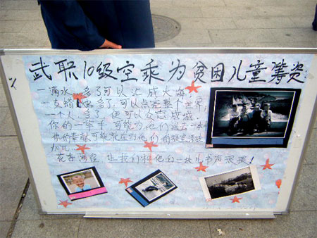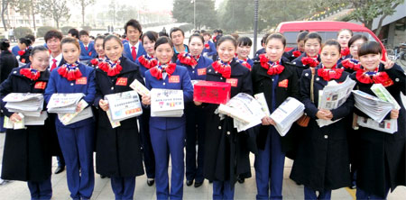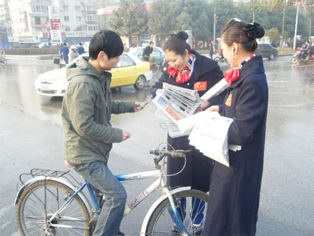 武職空乘專業(yè)學生賣報獻愛心 本網(wǎng)訊 2010年12月5日,武漢職業(yè)技術(shù)學院空中乘務(wù)專業(yè)10級學生和國際日語10301班學生為幫助貴州貧困地區(qū)學生,特舉行了義賣報紙籌捐活動。