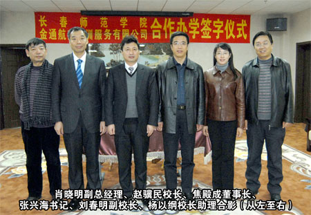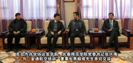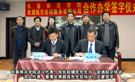合作雙贏、共謀事業(yè)、科學(xué)發(fā)展 長春師范學(xué)院與“金通航空培訓(xùn)” 簽訂合作辦學(xué)協(xié)議 本報訊 高校和企業(yè)合作培養(yǎng)人才是一種新型的育才模式,通過校企合作可以為大學(xué)生提供良好的培養(yǎng)教育和實習(xí)場所,構(gòu)建起高校畢業(yè)生成才就業(yè)的橋梁。為了填補吉林省高校中本科空乘專業(yè)的空白,提升長春師范學(xué)院和“金通航空培訓(xùn)”的辦學(xué)模式及社會影響力,2010年 12月15日下午,長春師范學(xué)院與“金通航空培訓(xùn)”合作辦學(xué)簽字儀式在長春隆重舉行。長春師范學(xué)院黨委書記張興海、校長趙驥民、副校長劉春明、校長助理楊以綱以及學(xué)院教務(wù)處、招生辦領(lǐng)導(dǎo),金通航空培訓(xùn)服務(wù)有限公司董事長兼總經(jīng)理焦殿成、副總經(jīng)理兼招生工作部總經(jīng)理肖曉明、董事長助理兼綜合管理部總經(jīng)理付曉軍,參加了合作辦學(xué)簽字儀式。
