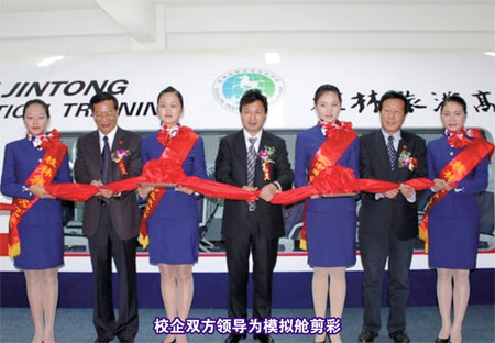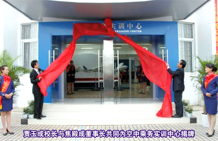 “金通航空培訓”焦殿成董事長與桂林旅專賈玉成校長共同為乘務(wù)實訓中心揭牌。校企雙方領(lǐng)導為模擬艙剪彩。