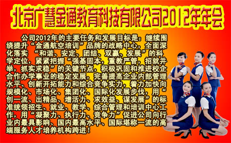 強(qiáng)基固本 招就并舉 抓實(shí)求穩(wěn) 為全面實(shí)現(xiàn)科學(xué)和可持續(xù)發(fā)展而努力奮斗 本網(wǎng)訊:龍騰虎躍賀新春,四海笙歌喜臨門。時光飛逝如閃電,轉(zhuǎn)眼間白駒過隙,充實(shí)忙碌的2011年已經(jīng)過去,滿懷期待的2012年向我們走來。勤勞智慧的金通人在2012年2月3日這一天濟(jì)濟(jì)一堂,一起回顧過去希冀未來,共同展望未來一年的目標(biāo)與發(fā)展,為2012新的起點(diǎn)開啟新篇章。 (焦殿成董事長出席此次年會并發(fā)表重要講話) 來自內(nèi)蒙古呼和浩特、通遼,廣西桂林、南寧,山西太原、臨汾,重慶、貴州貴陽、云南昆明、安徽蕪湖、吉林長春、江蘇南京、湖北武漢、山東濟(jì)南、河北秦皇島、浙江杭州、新疆烏魯木齊、天津、福建廈門、遼寧沈陽以及北京的全國各地辦事處70余名中層以上干部及北京總部全體成員參加了年會。本次會議由綜合管理部總經(jīng)理付曉軍主持,焦殿成董事長做了“強(qiáng)基固本、招就并舉、抓實(shí)求穩(wěn),為全面實(shí)現(xiàn)科學(xué)和可持續(xù)發(fā)展而努力奮斗”的重要講話。年會共分為六項(xiàng)議程。 (會議現(xiàn)場) 在回顧中進(jìn)步,在總結(jié)中成長,在期許中前進(jìn)。全國駐各地、各院校工作處主任依次進(jìn)行了詳細(xì)的工作匯報,就合作院?粘藢I(yè)2011年的招生、教學(xué)、就業(yè)、費(fèi)用收繳、學(xué)生管理等情況進(jìn)行了總結(jié),還憧憬展望了2012年新學(xué)期的工作思路,董事長焦殿成認(rèn)真聽取了匯報,時而點(diǎn)頭贊許,時而若有所思。隨后,財務(wù)工作處、招生工作部、院校教學(xué)工作部、就業(yè)工作部、綜合管理部、培訓(xùn)中心也結(jié)合各自2011年的工作情況、計劃完成情況,以及2012年下一步的工作安排做了充分詳實(shí)的匯報和交流。大家紛紛表示,2012年是挑戰(zhàn)與機(jī)會并存的一年,全公司上下有決心完成2012年充滿挑戰(zhàn)的計劃與任務(wù),以更加認(rèn)真專注的態(tài)度為公司創(chuàng)造更大的利潤與價值。 作為會議重頭戲的議程是公司董事長兼總經(jīng)理焦殿成先生所做的工作報告。董事長焦殿成先生激情洋溢的講話將會場熱烈的氣氛推向了最高潮。 焦董首先向全體員工道一聲新年的祝福:祝愿大家在新的一年里健康快樂、平安幸福!焦董說:“2011年,是公司發(fā)展歷程中極不平凡的一年。我們緊緊圍繞“和諧、安定、團(tuán)結(jié)、雙贏、發(fā)展”的工作指導(dǎo)思想,全體員工精誠團(tuán)結(jié),敬業(yè)向上,做了大量的、富有成效的工作,取得了一個又一個成績。可以說,2011年是公司的發(fā)展之年、轉(zhuǎn)型之年、創(chuàng)新之年、收獲之年! 在回顧和總結(jié)2011年的工作時,焦總強(qiáng)調(diào),在充滿希望、勵志圖強(qiáng)的2011年,公司主要在以下六個方面取得了突出成績: 一是合作辦學(xué)從高職大專向國家公辦本科院?邕M(jìn),層次和水平得到大幅度提升,標(biāo)志著企業(yè)轉(zhuǎn)型工作起步早、把握準(zhǔn)、力度大、效果好。2011年,“金通航空培訓(xùn)“在原有七所本科院校的基礎(chǔ)上,先后新加盟了蘇州大學(xué)文正學(xué)院、青海師范大學(xué)、廣西師范學(xué)院、山西師范大學(xué)、西北師范大學(xué)、杭州師范大學(xué)錢江學(xué)院六所本科院校,使本科合作院校增加到了13所,層次上得到提升,規(guī)模上得到拓展,效益上得到保障,標(biāo)志著公司戰(zhàn)略轉(zhuǎn)型取得圓滿成功。同時,在做好現(xiàn)有?坪献髟盒9ぷ鞯幕A(chǔ)上,又與西南政法大學(xué)屬下的重慶海聯(lián)職業(yè)技術(shù)學(xué)院、與安徽淮北職業(yè)技術(shù)學(xué)院建立了硬性的合作辦學(xué)關(guān)系。 二是就業(yè)工作取得了可喜成績。截止2011年底,組織升空就業(yè)面試 58次,涉及16個航空公司,推薦升空就業(yè)970人,完成全年升空就業(yè)指標(biāo)數(shù)的103.6%;組織地面就業(yè)面試 18次,涉及20個機(jī)場等單位,推薦地面就業(yè)545人。 三是院校教學(xué)管理工作更加規(guī)范。在院校教學(xué)工作部的緊張努力下,作為公司開發(fā)的重要基礎(chǔ)項(xiàng)目——七本空乘專業(yè)主干課程教材編輯、審核成書,正式由民航出版社出版,新教材在合作院;蚍呛献髟盒?粘藢I(yè)中普遍推廣使用,得到了較高評價。 四是招生工作進(jìn)展順利。2011年,合作院校的招生工作院校多、范圍廣、層次差異、時間集中是突出特點(diǎn),公司招生工作部以建立生源基地為重點(diǎn),保證生源質(zhì)量,不斷提高了招生能力,做到了招生計劃、招生范圍、招生人員的合理安排,科學(xué)組織實(shí)施。公司各單位和參與招生工作的同志服從統(tǒng)一調(diào)度,在招生期間發(fā)揚(yáng)了胸懷全局、吃苦耐勞、團(tuán)結(jié)協(xié)作、雷厲風(fēng)行、優(yōu)質(zhì)高效的“金通精神”,竭盡所能,全力配合,做到了凝聚力、執(zhí)行力的高度統(tǒng)一。 五是舉辦了規(guī)模大、層次高、歷時長、全國性參與的 “2011年全國高等院校空乘專業(yè)推介展示會”。從2011年6月8日到7月10日,我們成功地與中國民航人力資源開發(fā)中心合作,精細(xì)籌劃、力排干擾、追求完美、展示智慧、體現(xiàn)魄力、實(shí)現(xiàn)超越,取得了圓滿成功。 六是公司的內(nèi)部建設(shè)得到