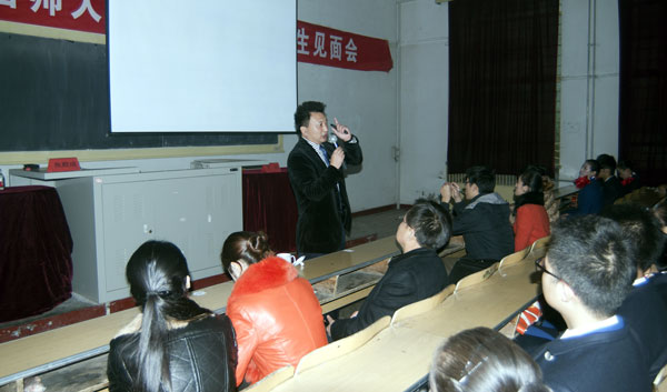 焦殿成董事長(zhǎng)在致辭中,首先代表北京廣慧金通教育科技有限公司,熱烈歡迎各位懷揣藍(lán)天夢(mèng)想的莘莘學(xué)子,來(lái)到山西師范大學(xué)空乘專業(yè)求學(xué)深造。同時(shí),對(duì)山西師范大學(xué)的各級(jí)領(lǐng)導(dǎo)和職能部門所給予“金通航空培訓(xùn)”的信任支持表示誠(chéng)摯的感謝!焦總講到:山西師范大學(xué)始終把教學(xué)質(zhì)量作為立校之本,以學(xué)科建設(shè)為龍頭,不斷深化教學(xué)改革,強(qiáng)化教學(xué)管理,是一所文理并重、學(xué)科齊全、治學(xué)嚴(yán)謹(jǐn)、基礎(chǔ)扎實(shí)、國(guó)內(nèi)一流的綜合性師范大學(xué)。2011年12月30日,校企雙方本著合作共贏、創(chuàng)新發(fā)展的科學(xué)理念,簽定了為期8年的《合作辦學(xué)協(xié)議》,共同邁出了校企合作發(fā)展的堅(jiān)實(shí)一步,F(xiàn)在,已經(jīng)招生兩屆共計(jì)562名學(xué)生,其中:大一學(xué)生207名(一本),大二學(xué)生355名(一本218名,三本137名)。尤其是隨著校企合作的逐步深入,貴我雙方審時(shí)度勢(shì)、共同努力,在2013年拓展了招生層次與規(guī)模,啟動(dòng)了本科二批C類(三本)招生,實(shí)現(xiàn)了空乘專業(yè)在本科層次上招生范圍的全覆蓋,這是校企合作實(shí)現(xiàn)廣度發(fā)展的標(biāo)志,是校企合作項(xiàng)目走向深度融合的范例,更是校企雙方資源形成高度整合的典范。焦總強(qiáng)調(diào),隨著校企合作項(xiàng)目的實(shí)質(zhì)性展開,為了滿足空乘專業(yè)教學(xué)實(shí)訓(xùn)需要,合作雙方都極為重視空乘專業(yè)教學(xué)實(shí)訓(xùn)中心建設(shè)。山西師范大學(xué)充分利用各方面的資源和力量,盡最大努力完成了實(shí)訓(xùn)中心選址調(diào)配和改建裝修,為空乘專業(yè)教學(xué)管理工作奠定了良好基礎(chǔ)。作為真誠(chéng)的合作伙伴,我們?cè)谂鋫鋬?yōu)秀管理團(tuán)隊(duì)和專業(yè)教員、輔導(dǎo)員的基礎(chǔ)上,為空乘專業(yè)教學(xué)實(shí)訓(xùn)中心配置了具備客艙設(shè)備理論學(xué)習(xí)、客艙服務(wù)模擬訓(xùn)練等19項(xiàng)主要功能、具備客艙失密使用氧氣面罩訓(xùn)練等4項(xiàng)輔助功能的“民航乘務(wù)模擬訓(xùn)練艙”,配備了199架國(guó)內(nèi)外航空公司的所有機(jī)模,安裝了具有自主知識(shí)產(chǎn)權(quán)的民航乘務(wù)員CBT教學(xué)軟件,為提高教學(xué)培養(yǎng)質(zhì)量創(chuàng)造了必備條件。焦總指出,在校企合作辦學(xué)的發(fā)展歷程中,我們深切感到,山西師范大學(xué)各級(jí)領(lǐng)導(dǎo)和職能部門嚴(yán)謹(jǐn)務(wù)實(shí)、開拓進(jìn)取,體現(xiàn)了高水平的凝聚力和執(zhí)行力。山西師范大學(xué)教育技術(shù)與傳媒學(xué)院的領(lǐng)導(dǎo)和老師,愛(ài)崗敬業(yè)、求實(shí)高效,展現(xiàn)出旺盛的工作熱情和負(fù)責(zé)精神。為此,我們將在今后的合作辦學(xué)歷程中,堅(jiān)持校企合作辦學(xué)方向、增強(qiáng)校企合作友誼、保證校企合作成果,與山西師范大學(xué)緊密配合,攜手譜寫山西師范大學(xué)空乘專業(yè)建設(shè)與發(fā)展的新篇章!最后,焦總希望各位同學(xué):要牢牢把握民航業(yè)大發(fā)展的歷史機(jī)遇,充分利用山西師范大學(xué)教學(xué)設(shè)施優(yōu)良、文化氛圍濃郁、創(chuàng)新人才輩出、綜合實(shí)力雄厚、社會(huì)影響廣泛的優(yōu)越條件,有效借助“金通航空培訓(xùn)”的豐富資源所鋪就的就業(yè)成才之路,勵(lì)志勤勉,學(xué)業(yè)有成,事業(yè)有為,早日實(shí)現(xiàn)展翅藍(lán)天的夢(mèng)想!