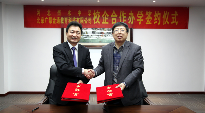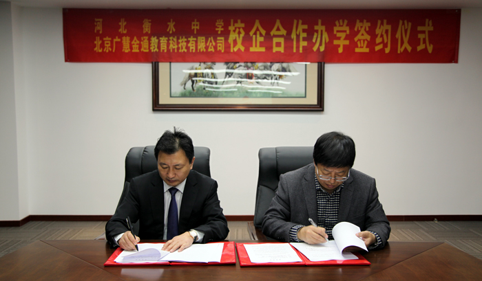 2015年4月9日,建立在校企合作、創(chuàng)新發(fā)展的基礎(chǔ)上,河北衡水中學(xué)與北京廣慧金通教育科技有限公司就聯(lián)合舉辦“校企合作(高中起點(diǎn))定向培養(yǎng)航空飛行員和乘務(wù)員、安全員”項(xiàng)目簽訂了《合作辦學(xué)協(xié)議》。在雙方的共同努力下,合作項(xiàng)目正式啟動并順利實(shí)施,在逐步健全和完善校企合作機(jī)制上取得了實(shí)質(zhì)性進(jìn)展。河北衡水中學(xué)副校長王建勇、北京廣慧金通教育科技有限公司董事長焦殿成代表雙方在合作協(xié)議上簽字。