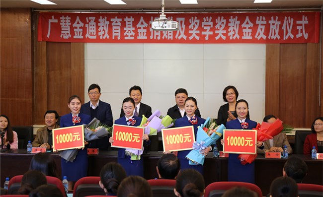 10月12日上午,內(nèi)蒙古民族大學(xué)教育基金會(huì)在霍林河校區(qū)勵(lì)志樓舉行“廣慧金通”教育基金捐贈(zèng)暨獎(jiǎng)學(xué)金獎(jiǎng)教金發(fā)放儀式。內(nèi)蒙古民族大學(xué)校長(zhǎng)陳永勝、副校長(zhǎng)任軍出席儀式。校長(zhǎng)助理、教育基金會(huì)理事長(zhǎng)朝倫巴特爾與廣慧金通教育科技有限公司董事長(zhǎng)焦殿成簽署了廣慧金通教育科技有限公司向內(nèi)蒙古民族大學(xué)《捐贈(zèng)協(xié)議》,朝倫巴特爾理事長(zhǎng)向焦殿成董事長(zhǎng)頒發(fā)《捐贈(zèng)證書》。旅游與航空服務(wù)學(xué)院院長(zhǎng)劉艷宣讀《關(guān)于發(fā)放“廣慧金通獎(jiǎng)學(xué)金、獎(jiǎng)教金”的決定》,與會(huì)嘉賓及領(lǐng)導(dǎo)為獲獎(jiǎng)的28名同學(xué)和17名教師發(fā)放了獎(jiǎng)金。廣慧金通教育科技有限公司董事長(zhǎng)焦殿成、內(nèi)蒙古民族大學(xué)校長(zhǎng)陳永勝分別講話。獲得“廣慧金通獎(jiǎng)學(xué)金”的學(xué)生代表、旅游與航空服務(wù)學(xué)院2014級(jí)空乘專業(yè)3班郝月同學(xué)作了表態(tài)發(fā)言。