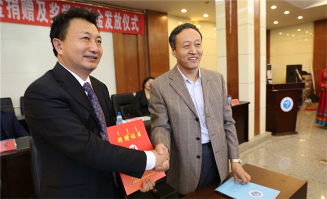 朝倫巴特爾理事長(zhǎng)向焦殿成董事長(zhǎng)頒發(fā)捐贈(zèng)證書