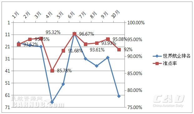 根據(jù)民航數(shù)據(jù)分析系統(tǒng)CADAS(Civil Aviation Data Analysis)發(fā)布的2015年10月《全球航空公司到港準(zhǔn)點(diǎn)率報(bào)告》,2015年1-10月濟(jì)州航空多數(shù)月份準(zhǔn)點(diǎn)率在九成以上,作為低成本航空濟(jì)州航空準(zhǔn)點(diǎn)率在全行業(yè)處于中上水平。