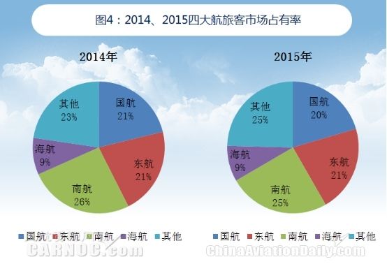 從各家航空公司比較重視的旅客市場占有率情況來看,2014年四大航(此處僅統(tǒng)計了上市公司數(shù)據(jù))以外的公司占23%,2015則提升至25%,四大航的市場份額旅游下降,增長較快的東航、海航份額保持不變,而國航、南航則分別下降一個百分點。