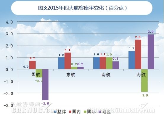 運力投放是考驗航空公司對市場的研判,而產出(包括周轉量、運輸量)增速則是包含了對市場的研判與市場的營銷兩大重要因素,在投入增速較快的情況下,如果產出增速快于投入增速,一般情況下,可以認為航空公司在市場開發(fā)挖掘能力有了相應提升。2015年,四大航的產出(以旅客周轉量衡量)增速均快于投入增速(座公里),一方面說明市場整體向好,另一方面說明四大航在加大運力投入的同時,市場開發(fā)力度也絲毫沒有松懈。