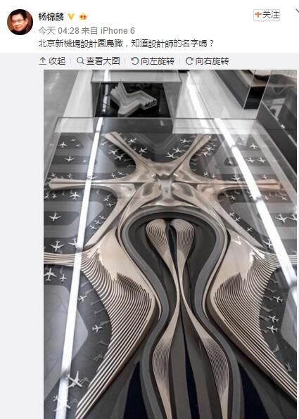 4月11日,微博大V楊錦麟發(fā)了一條北京新機場設計鳥瞰圖的微博。并問“知道設計師的名字嗎?” 這張圖片立刻引發(fā)了許多網(wǎng)友的評論和戲謔。