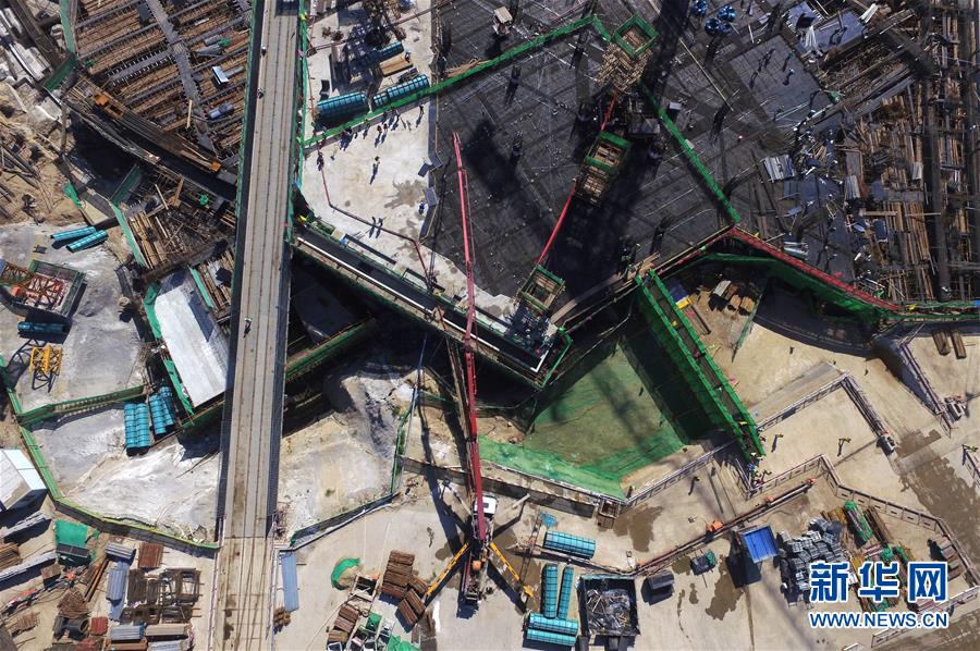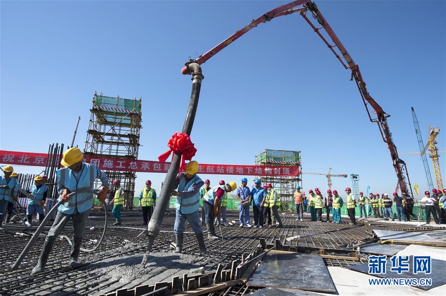 在北京新機(jī)場(chǎng)主航站樓施工現(xiàn)場(chǎng),施工工人在澆筑地下結(jié)構(gòu)工程最后一塊頂板(9月20日攝)。