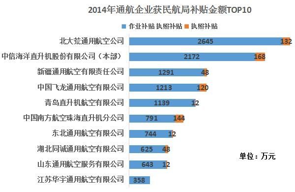獲得補(bǔ)貼金額前三名的企業(yè)為北大荒通航、中信海直(本部)和飛龍通航,分別獲得2915萬元、2481萬元和2354萬元的補(bǔ)貼總額。