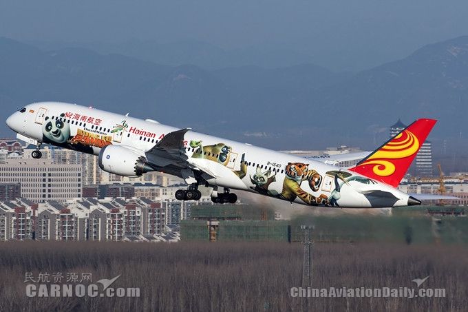 海航計(jì)劃推出6架《功夫熊貓》主題彩繪涂裝波音787-9飛機(jī),于2016-2017年陸續(xù)完成并投入使用,未來(lái)計(jì)劃執(zhí)飛海航中國(guó)至北美航線。