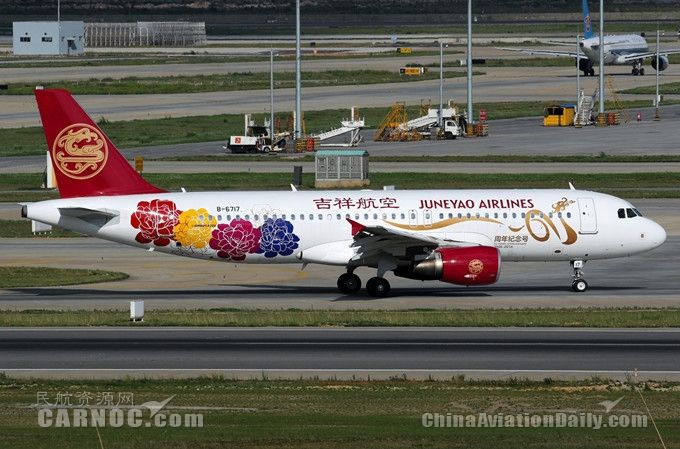 吉祥航空2016年迎來(lái)10周年,推出周年紀(jì)念彩繪,以數(shù)字10和中國(guó)傳統(tǒng)的龍鳳圖騰,搭配了吉祥慣用的金色,設(shè)計(jì)成一條金色流線型飄帶。