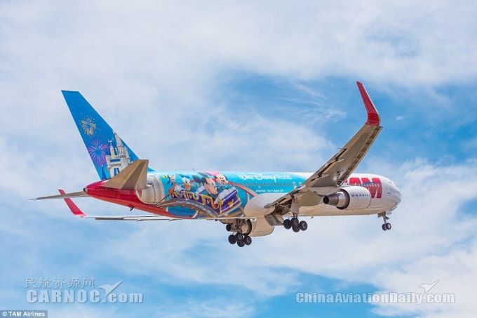 圖:巴西塔姆航空的迪斯尼彩繪飛機(jī)涂裝,米老鼠、唐老鴨、灰姑娘城堡等等,充滿浪漫童話色彩。
