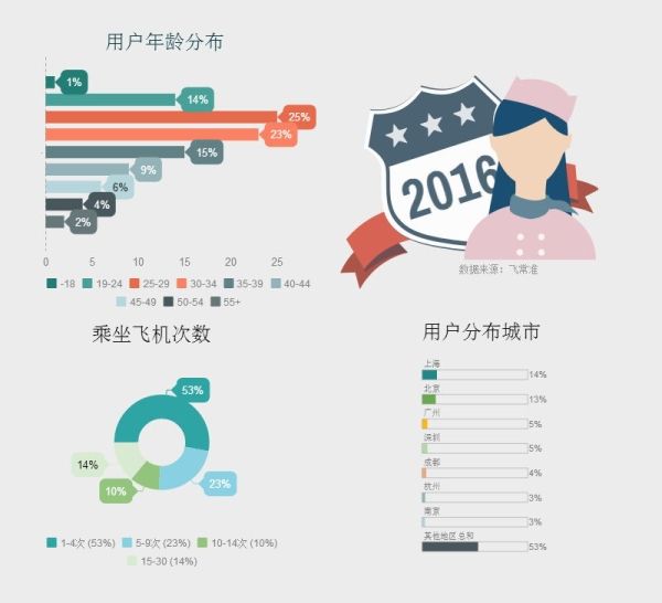 從乘客年齡分布圖看,乘機(jī)旅客以青年群體為主,近年來流行的“宅文化”并沒有體現(xiàn)在榜單中,其中25-34歲的人群占比達(dá)到50%。由此可見,80后、90后年輕人乘機(jī)出行比例較高。