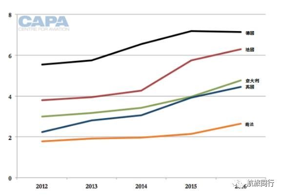 2016年中國航企在英國平均每天有4.4個航班。這些航企在意大利航線上的每日平均航班量稍高一些,為4.8個。而中國航企航班量最高的則是法國(每天6.3個航班)與德國(每天7.2個航班)。意大利與法國的航班量較高與旅游業(yè)相關(guān)。德國則是源于其屬于中國在歐洲最大的貿(mào)易伙伴,同時該國也是漢莎航空的老家,漢莎航空是中國國際航空的合伙伙伴,中國國際航空則屬于中國航企中國際航班業(yè)務(wù)量最大的一家。2016年荷蘭平均每天有2.6個由中國航企運營的航班,有這樣的航班量是源于天合聯(lián)盟內(nèi)的中國航企與其在歐洲的伙伴荷蘭航空之間有著合作關(guān)系。荷蘭航空和阿姆斯特丹為中國航企提供了連接至歐洲其他站點的機會。