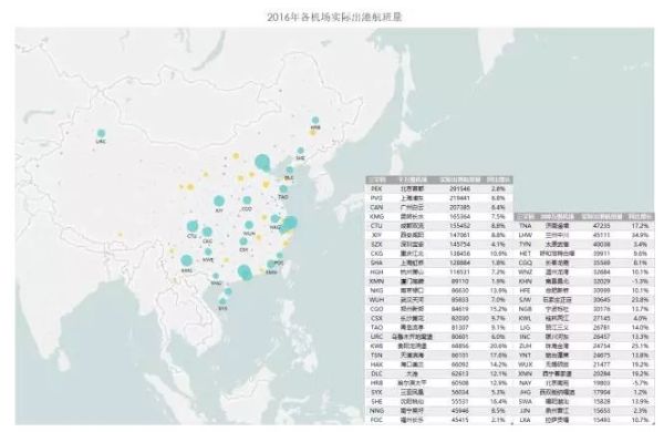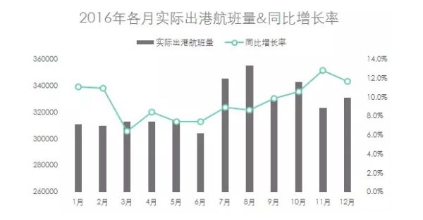 2016年國內(nèi)機(jī)場實(shí)際出港航班總量為389.5萬班次,與2015年相比,同比增長9.5%;
