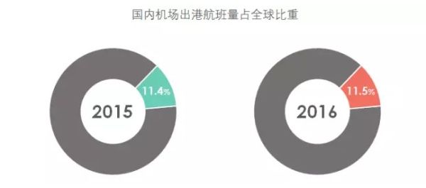 2016年國內(nèi)機(jī)場實(shí)際出港航班總量占全球機(jī)場實(shí)際出港航班總量的11.5%,與2015年(11.4%)相比,提高0.1%。