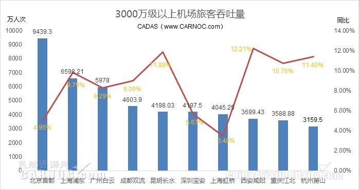 昆明長水、深圳寶安、上海虹橋旅客吞吐量突破4000萬;杭州蕭山突破3000萬,達到3159.5萬人次,成為國內(nèi)第十家年旅客吞吐量突破3000萬人次的機場。