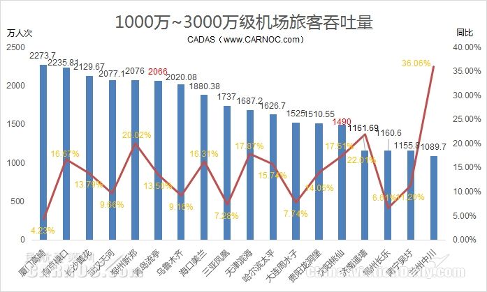 而蘭州中川及濟南遙墻分別以36%和22%的高增長速度,強勢突破千萬大關(guān),晉級千萬級機場俱樂部。