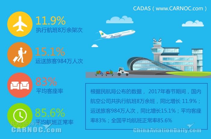 根據(jù)民航局公布的數(shù)據(jù), 2017年春節(jié)期間(1月27日至2月2日),國內(nèi)航空公司共執(zhí)行航班8萬余班,同比增長11.9%;運送旅客984萬人次,同比增長15.1%;提供座位數(shù)1283萬個,平均客座率83%。全國平均航班正常率85.6%,同比提高3.1%。