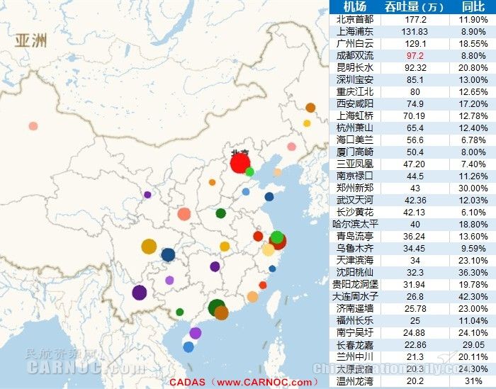 根據(jù)CADAS民航數(shù)據(jù)分析系統(tǒng)的統(tǒng)計數(shù)據(jù),北京首都、上海浦東、廣州白云三大機場的的旅客吞吐量均超過了百萬人次,遙遙領(lǐng)先其他機場。其中,北京首都運送旅客177.2萬人次,起降航班1.1萬架次;上海浦東旅客吞吐量131.8萬人次,航班8916架次;廣州白云旅客吞吐量129.1萬人次,航班8758架次。