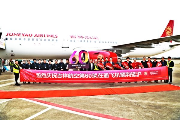新飛機于當(dāng)天凌晨從德國漢堡起飛,中途在哈薩克斯坦阿斯塔納國際機場短暫休整后繼續(xù)飛行,在下午13:55抵達(dá)上海浦東國際機場。吉祥航空營銷副總裁于成吉帶領(lǐng)公司及機組成員前往浦東機場接機,隨行人員拉起橫幅,高舉吉祥品牌色構(gòu)成的“60”字牌,在新飛機前合影留念。