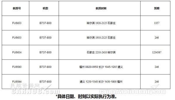 * 福州航空3月28日將分別開通哈爾濱至石家莊航線以及福州至長(zhǎng)沙、遵義新航線。本次兩條新開航線均由波音B737-800機(jī)型執(zhí)飛,其中哈爾濱=石家莊航線每日1班,福州=長(zhǎng)沙=遵義航線每周3班,具體航班時(shí)刻如下: