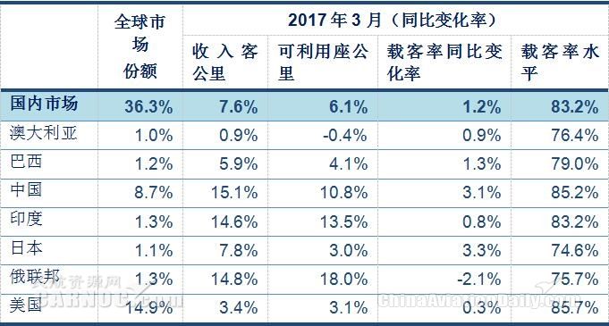 3月份,國內(nèi)客運需求增長7.6%。主要歸因于中國、印度和俄羅斯的客運量呈兩位數(shù)增長,日本客運量表現(xiàn)強勁,呈個位數(shù)增長。國內(nèi)運力增長6.1%,載客率提升了1.2個百分點,達到83.2%。