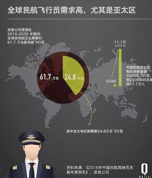 這些飛行員可能都有了新出路。目前中國有 5.05 萬名飛行員。波音公司預測,在未來二十年內(nèi),中國的航空公司每年都要新雇 5500 名飛行員才能滿足民航業(yè)的需求,也就是說每周都要有 100 多位飛行員入職才行。實際上,整個亞洲地區(qū)對飛行員的需求也是相當高的,在 2016 年到 2035 年期間,全球民用航空業(yè)需要大約 61.7 萬名新飛行員,其中光是亞太地區(qū)新需要的飛行員人數(shù)就有 24.8 萬名。