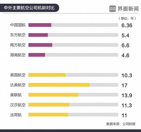 根據(jù)2016年的財報數(shù)據(jù),美國三大航空公司-美國航空(AmericanAirlines)、達美航空(DeltaAirlines)以及美國聯(lián)合航空(UniteAirlines)的平均機齡分別達到10.3年、17年以及13.9年,漢莎航空(LufthansaGroup)的平均機齡是11.3年,法荷航集團(AirFrance-KLM)的平均機齡是11年,幾乎是中國三大航的兩倍。