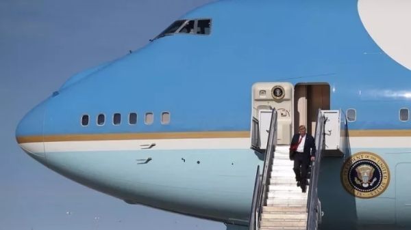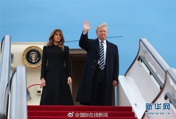 圖:特朗普搭乘空軍1號專機抵達首都機場。新華網(wǎng)圖片。